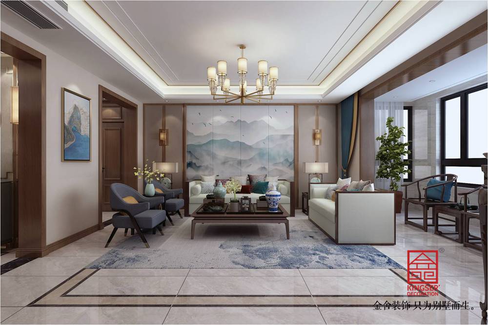 新中式风格为中国古典风格增添了现代空间装饰的实用特色。同时,在现代需求的基础上,运用古典元素来增加空间的东方魅力。古色古香的框架、山水画、古典壁灯等元素被用来展示豪宅优雅、渗透、大气的空间环境。