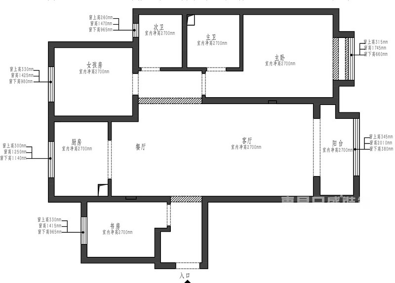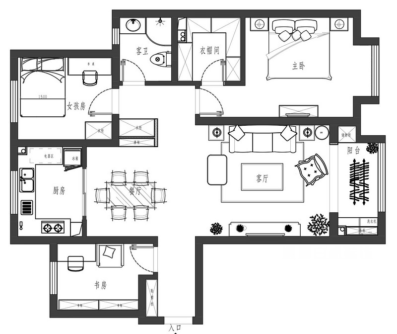 此户型方正,南北通透,通风采光比较好,空间分隔合理,厨房门口扩大,使利用空间更大,更好的增加通风和采光,主卧的飘窗拆除,使主卧空间变大,显得不是很拥挤,给人一个舒适的居住空间,采用用本公司香草天空的衣柜,使整个空间更加美观,从而也增加了室内的储物空间,也使室内更加干净整洁。