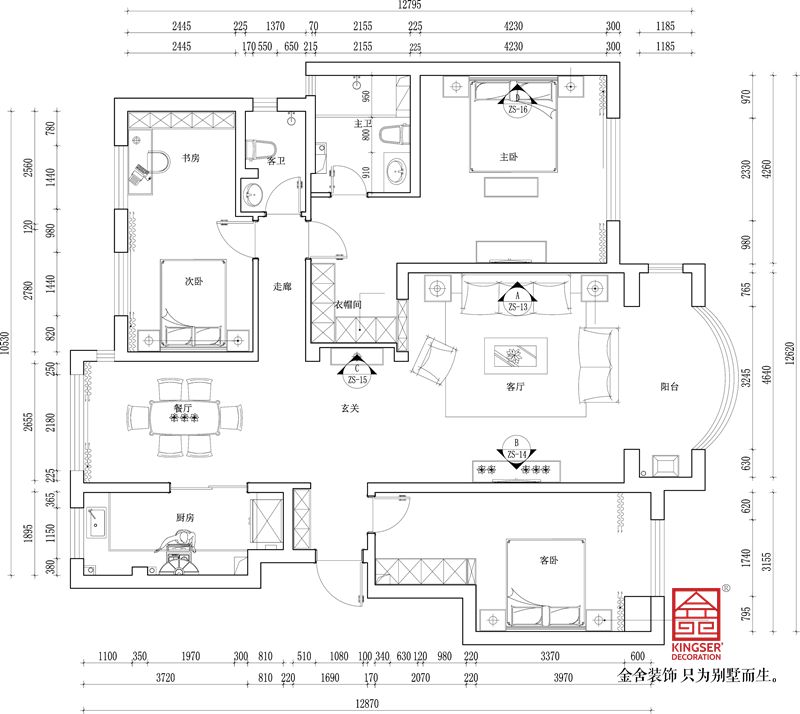 4、拆除一部分走廊墙体,使走廊变得不再狭长,客卫墙体外扩增加了卫生间的面积,同时主卫也扩大了面积,北卧室的墙拆除变成开敞书房加卧室。