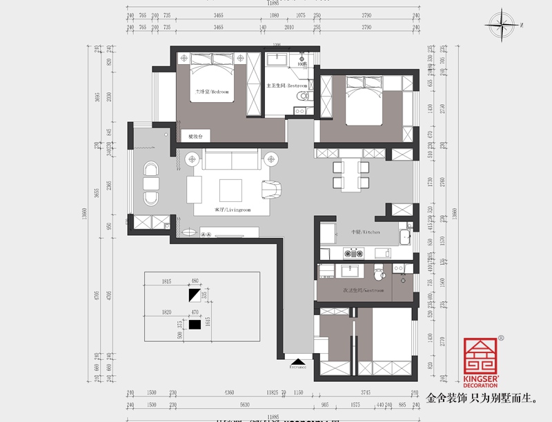 餐厅空间拆除与赠送空间之间的墙体,增大自家空间量,阳台拆除室外机的墙体,增大自家空间量,因为使用中央空调外机放置卧室外机位置,卧室新建墙体主要目的是侧板的收口和柜子空间量的扩大.
