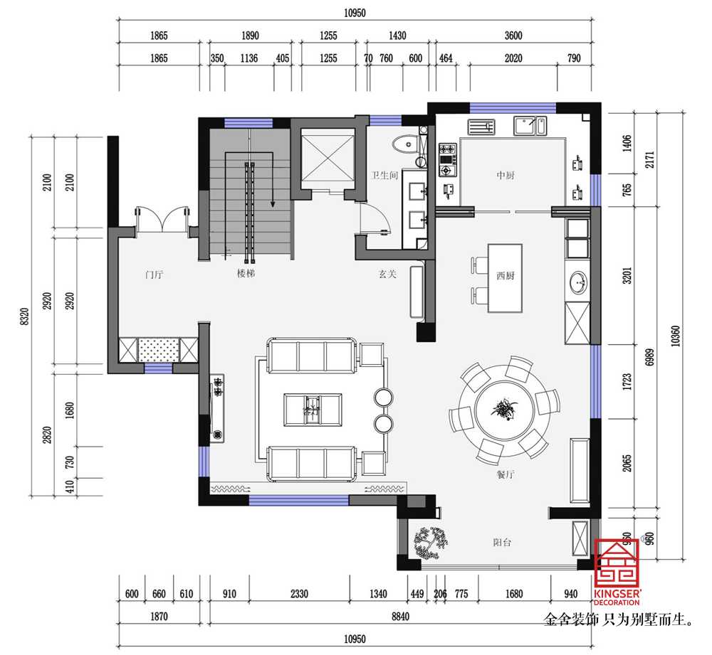 ① 将窄长空间合理利用划分为中西厨。厨房餐厅南北相连,就餐、使用便利。就餐同时可以观景。