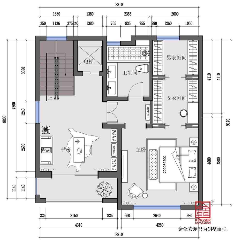 ① 豪华套件,区域划分明确,动静分离,衣帽间与卫生间分离。