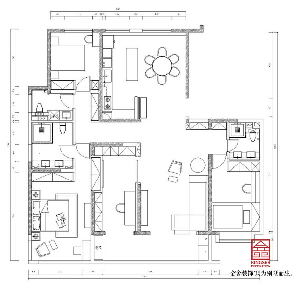 ③餐厅和厨房虽大,但是没有大宅的风范,可以整个把厨房和餐厅都打开,做成围合式的,这样更有大宅的感觉