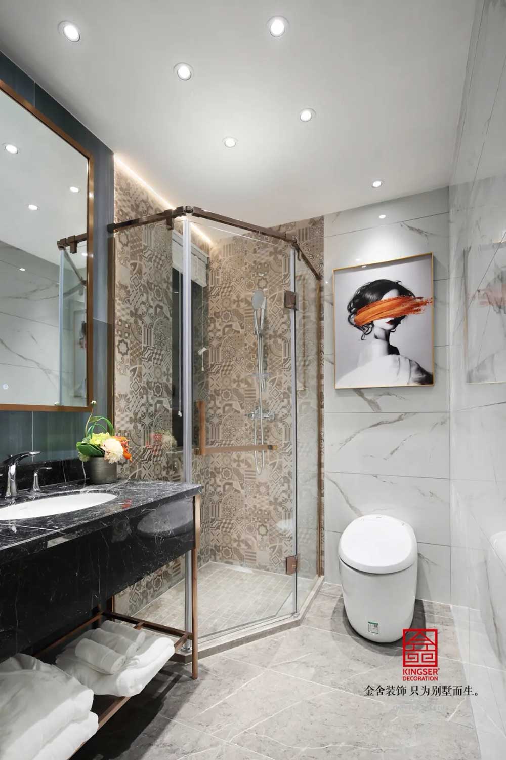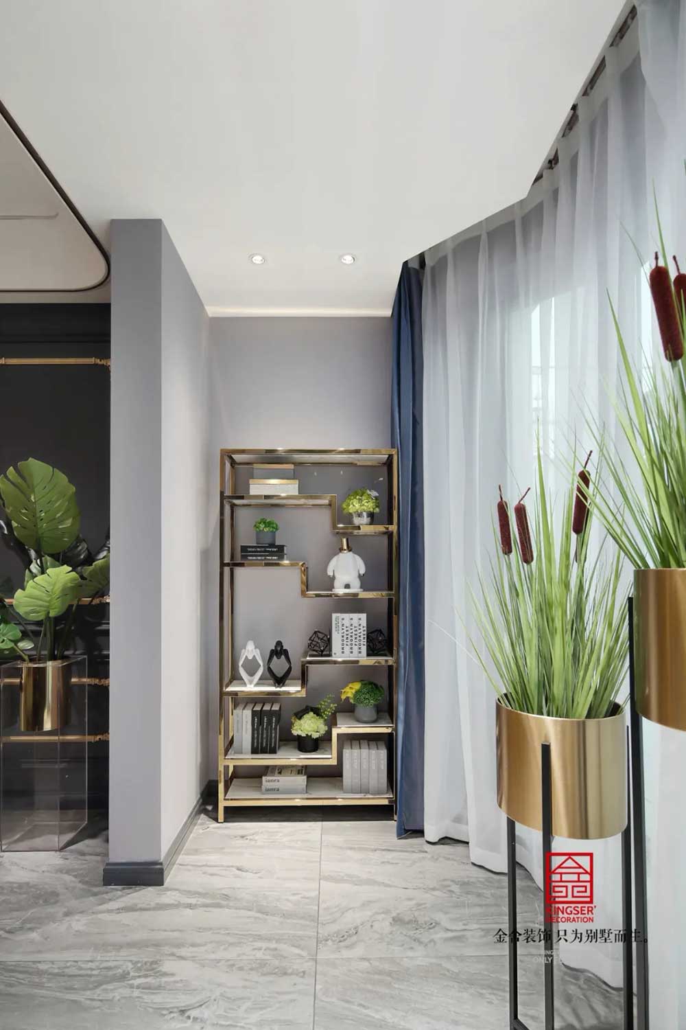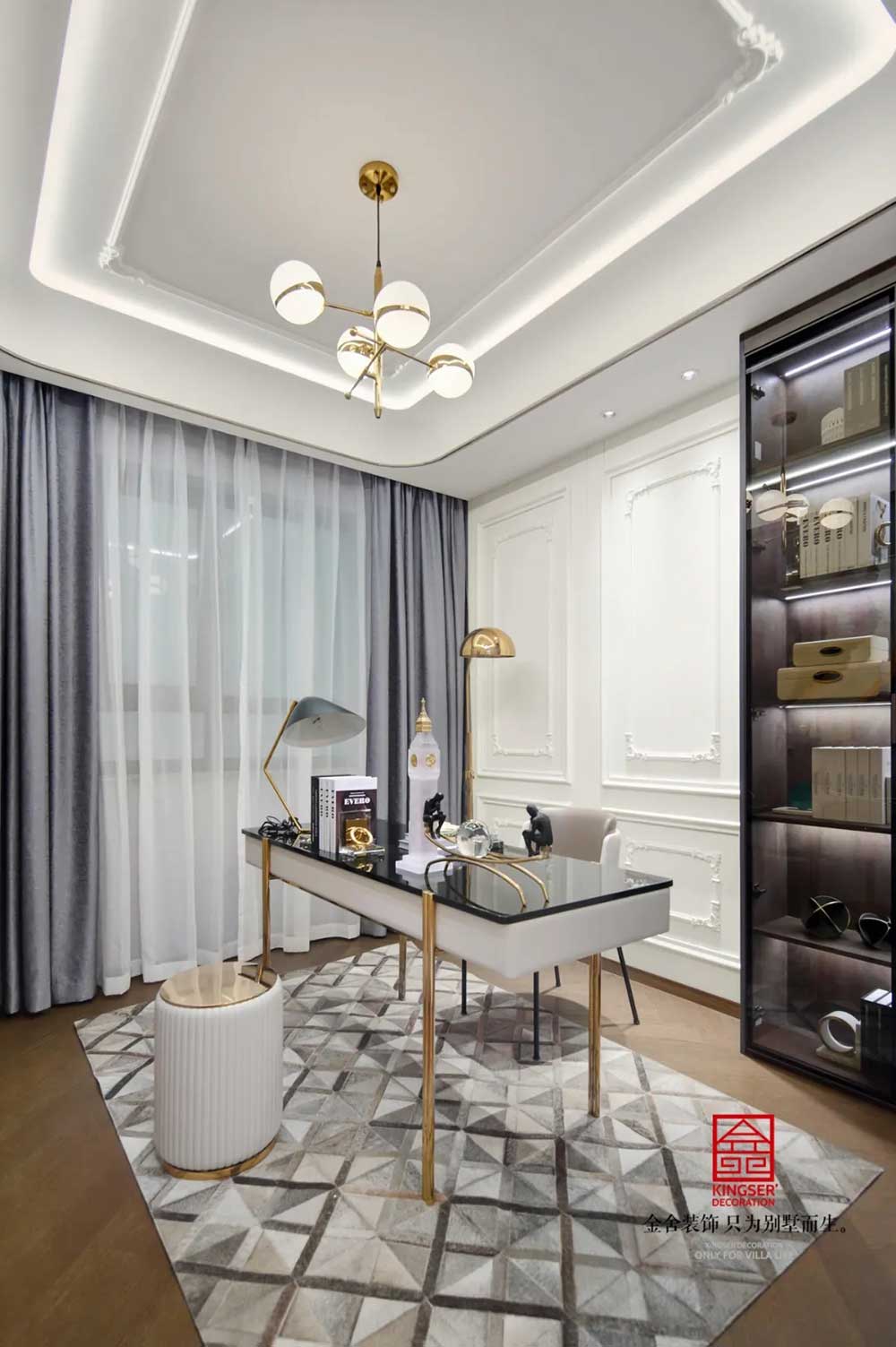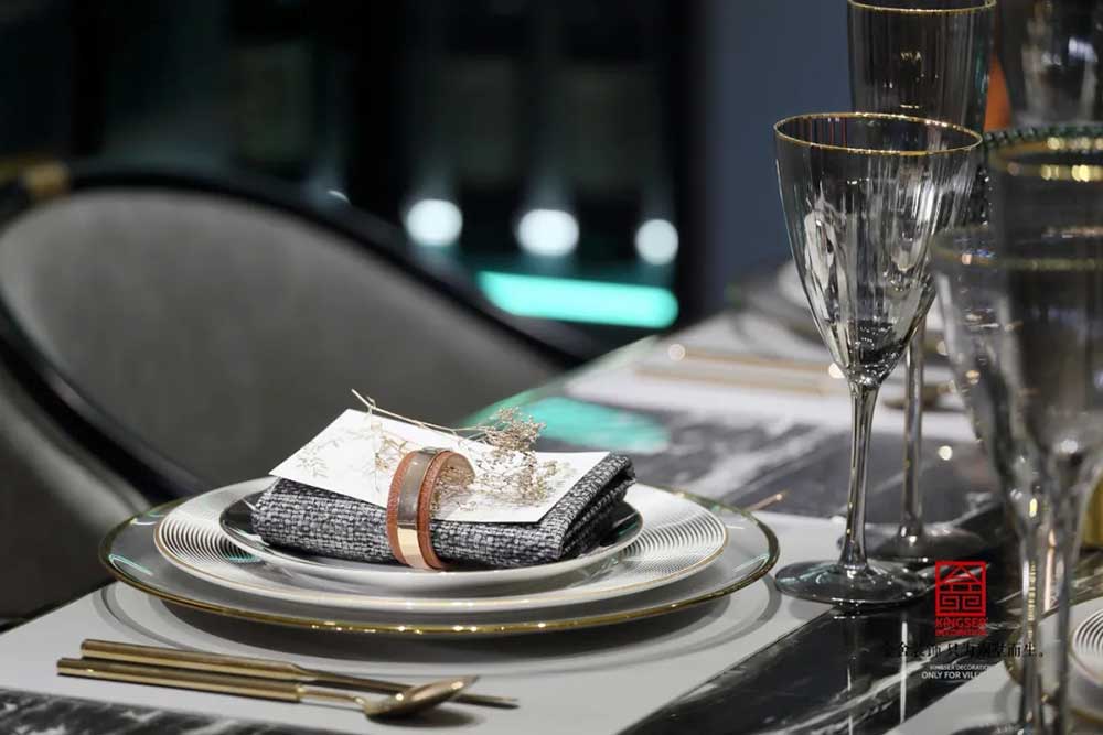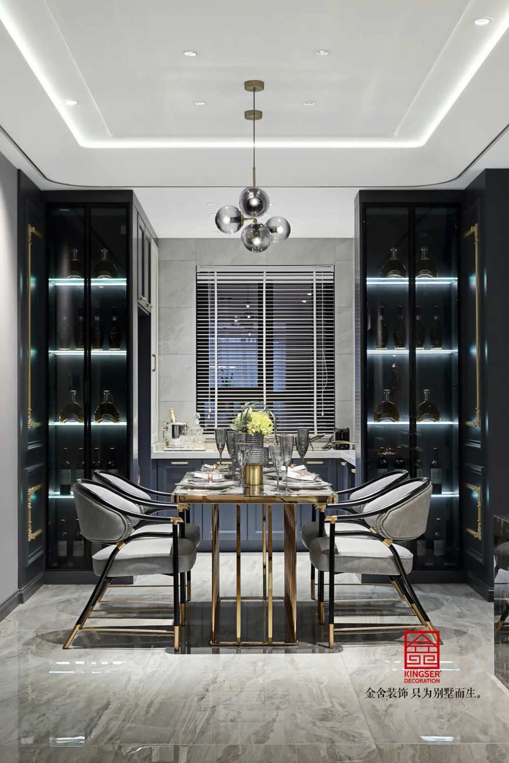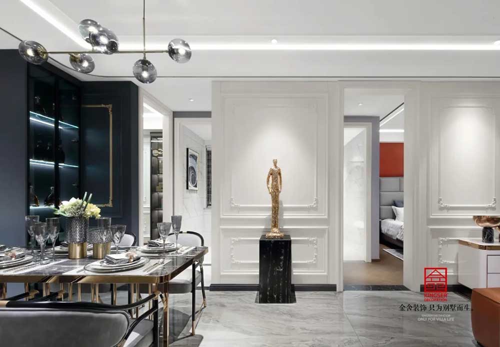 深蓝、古铜和灰色调勾勒出绅士的高雅格调和品味。从空间利用到配色处理,匠心独具,每一个空间都浓缩着设计师对新古典的独特理解。