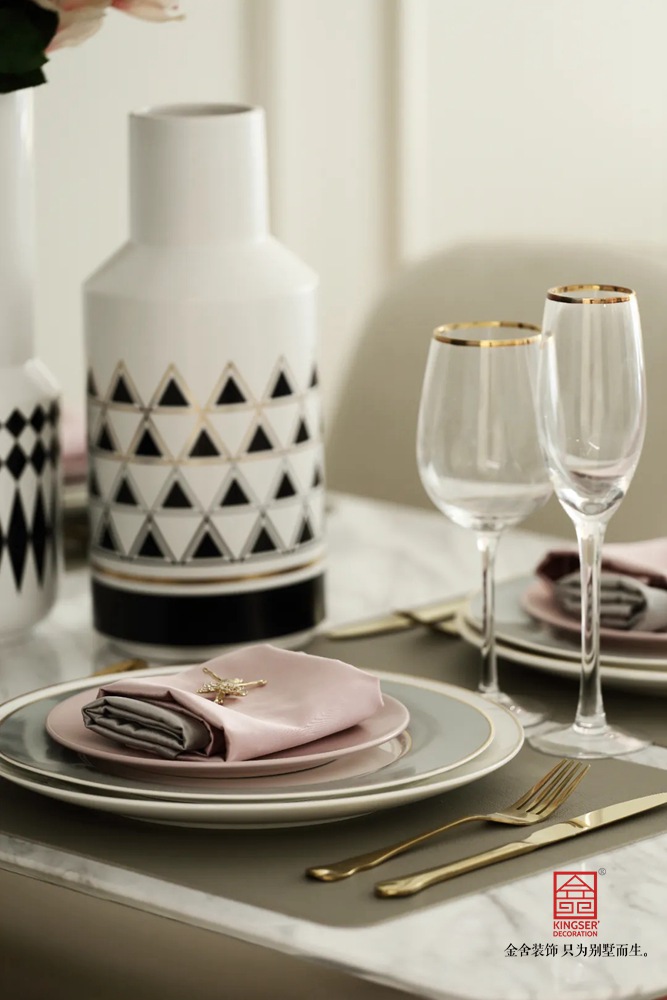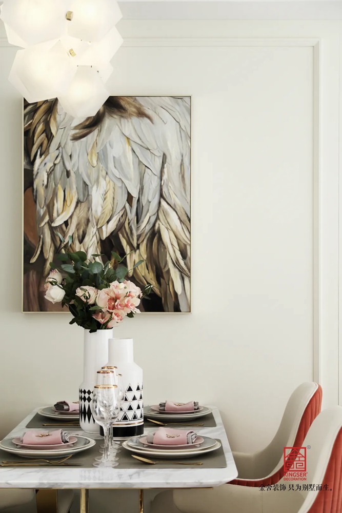 餐桌上配有轻奢风格的花瓶和餐具,提升房间的华丽气质,让空间不再单调。白色与橘红配色的餐边椅也让整个空间看起来更具时尚的温度。