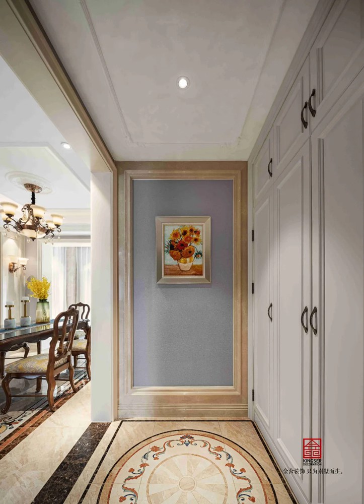 门厅位置透过设计师的设计来凸显欧式的纯然风情及深厚的文化底蕴,走廊间色调柔和,给人高贵舒适的感受,地面拼花为简洁的地板起点缀作用,梵高的向日葵挂画彰显业主品位。