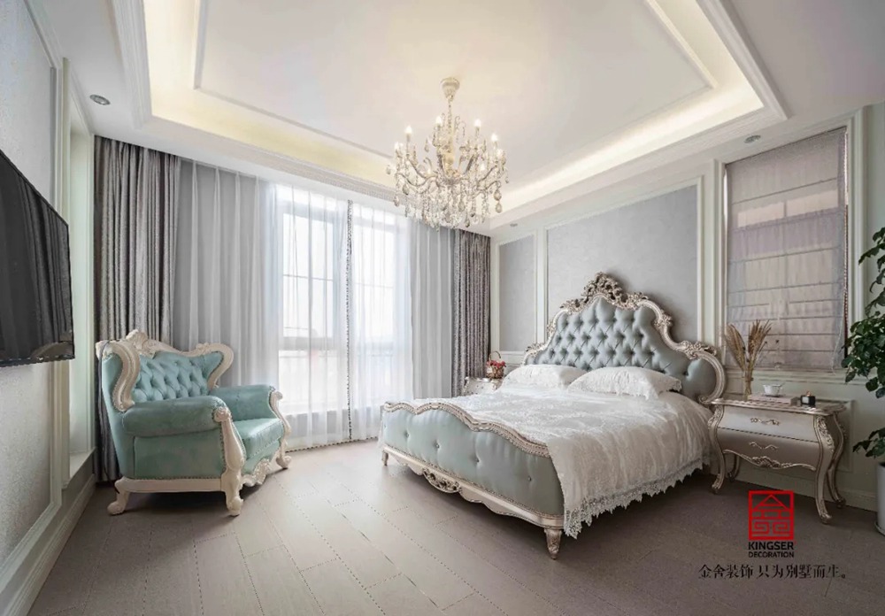 白色的空间,纯净柔美,就像冰雪奇缘中的艾莎公主,在白色的雪地中起舞,蓝色的裙摆随着风飞扬,淡妆浓抹的家居色彩,点缀着一点点晶莹剔透的纯洁与和谐。