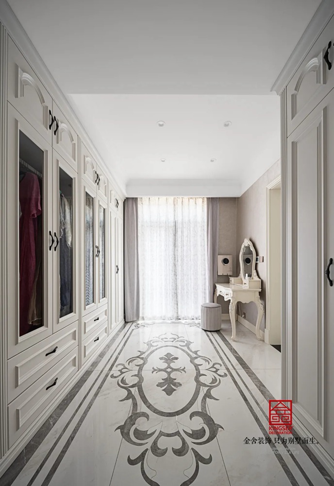 巨大的地面拼花就像在讲述一个唯美的故事,婉转而轻盈,又好似在诉说着那种独到的欧式情怀,同时通顶的衣柜保证了整个空间的收纳和衣物的摆放。
