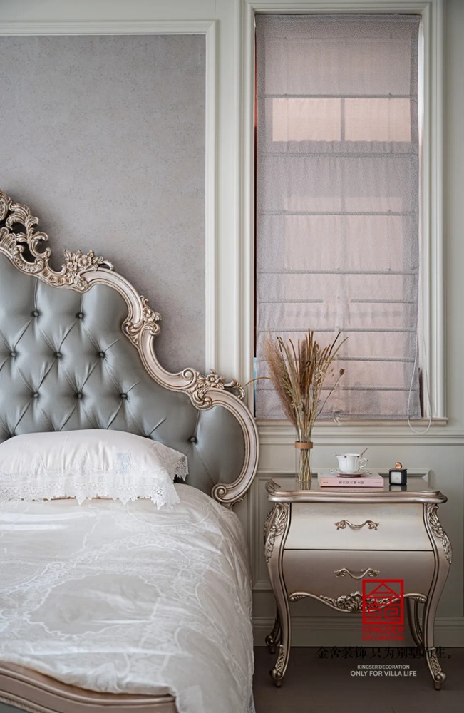 柔软的床包和床品赋予了空间丰富饱满的情感,经典的欧式装修风格表现奢美华贵的格调,而背景墙上的清淡壁布则为空间带了清幽的美感,增添清新之色。