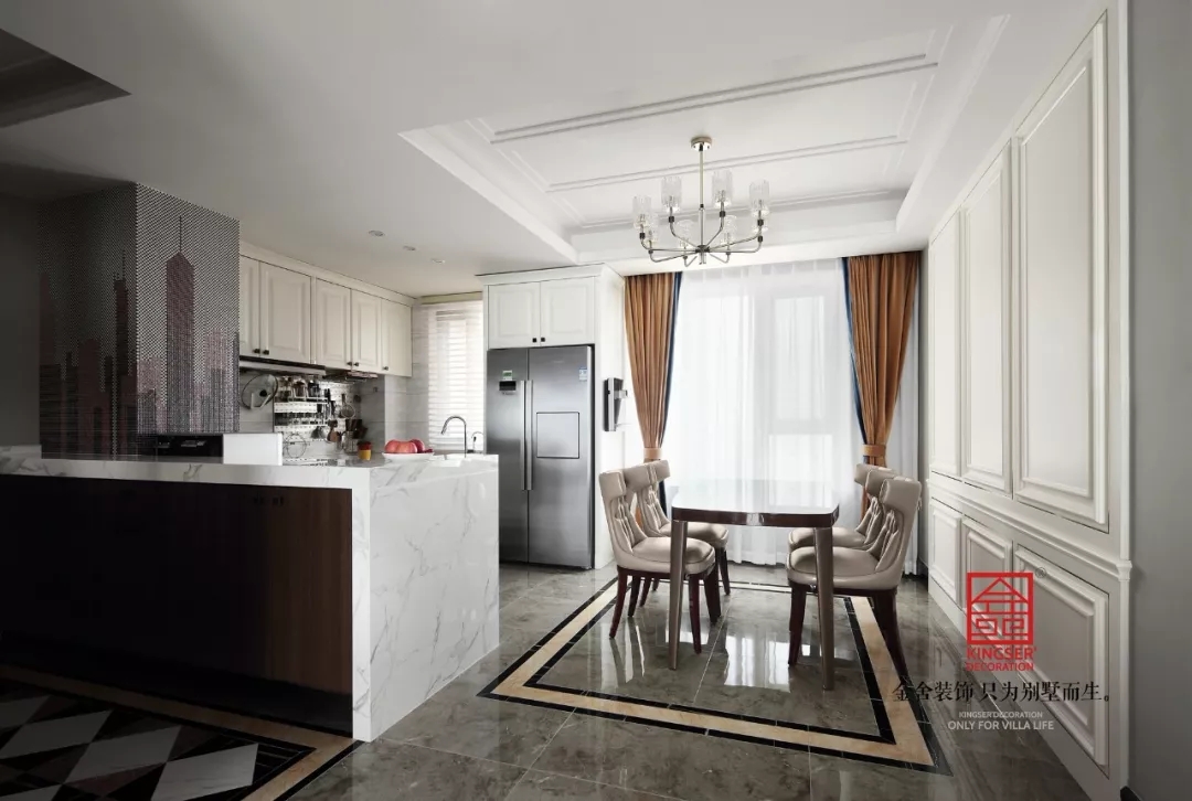 厨房采用的是开放的西厨式设计,不算很大的空间内将所有的电器及其他厨房设施都安排得井井有条,剪影一般的画作让这个空间多出一份梦幻的色彩。