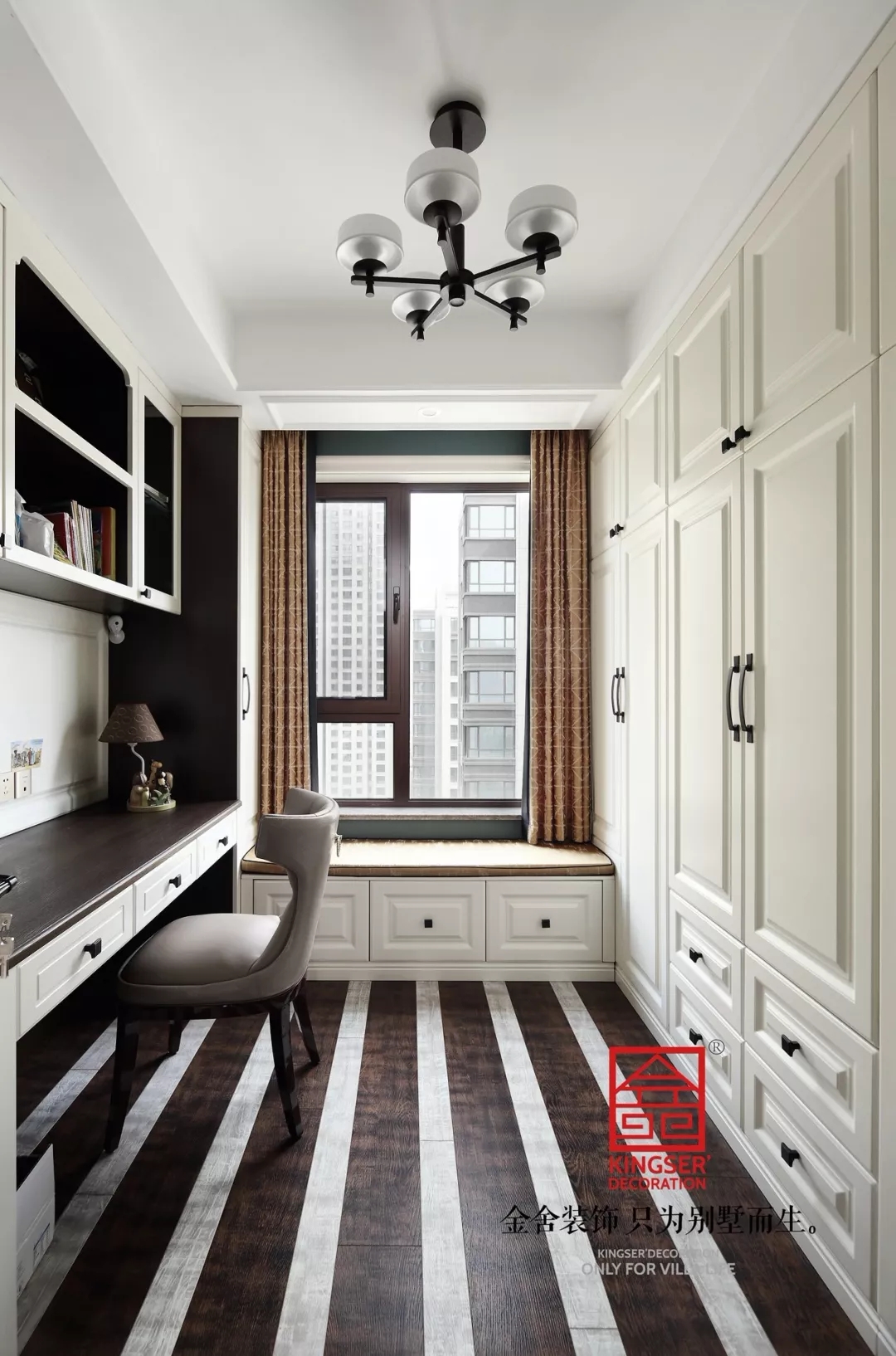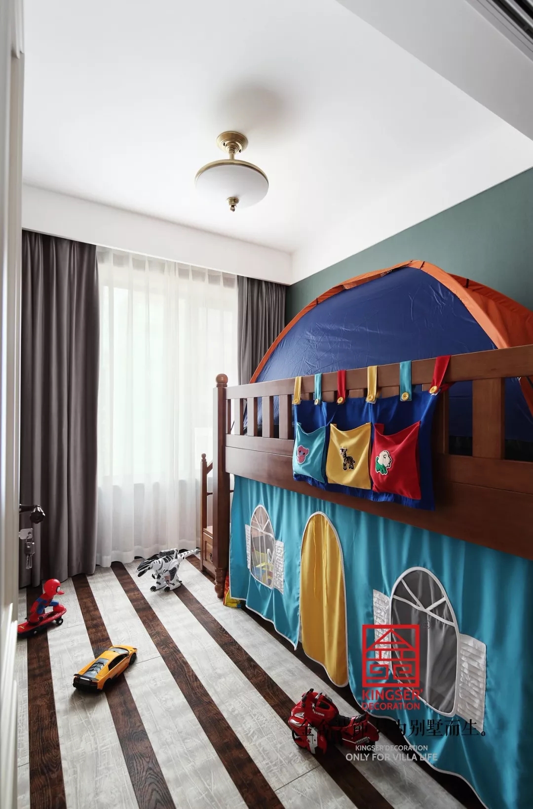 儿童房地面铺上了白褐相间的木地板,让人有一种仿佛走在地毯上的视觉冲击,用布艺做的封闭式床铺,让孩子有无限的遐想。地面上摆满了童趣的儿童玩具与摆饰,为孩子们营造出快乐舒适的成长天地。