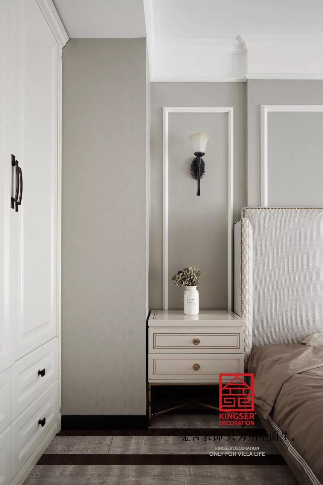 整个卧室为灰色基调的细节里加入鲜活的软装布艺,在端庄沉稳的空间里,点亮了温馨的气息,细腻绵软的感觉瞬间在空间中炸裂,让处在空间中的人都能体会到卧室给予使用者的无限舒适。