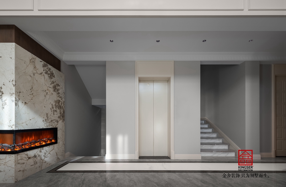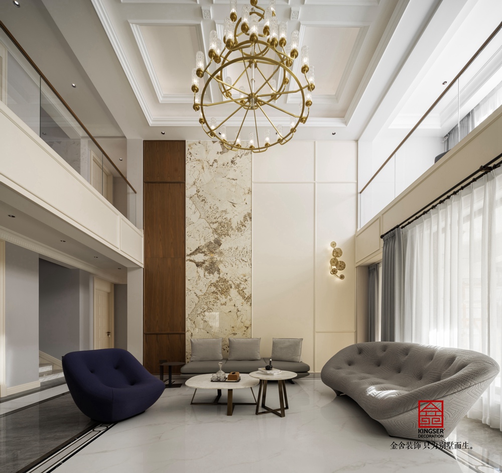 别墅的客厅,无疑是整栋建筑中的璀璨明珠。在挑高六米的宏伟空间中,我们巧妙地布置了一个简约风格的转角壁炉区,与素色沙发相映成趣,营造出一种既现代又舒适的氛围。