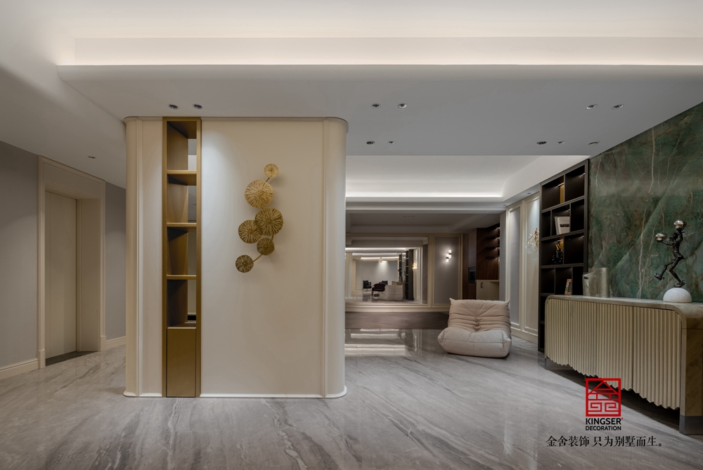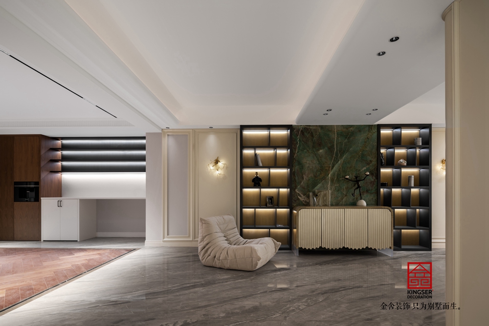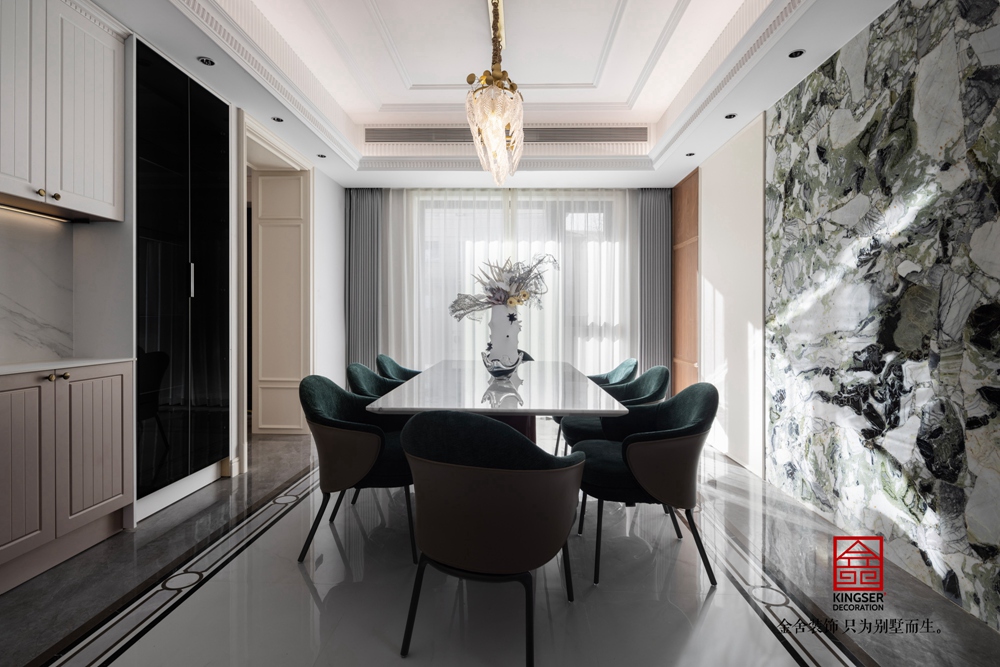 餐厅空间采用了透光奢石,这种材质以其高贵的气质和独特的纹理,为餐厨空间增添了一份奢华感。