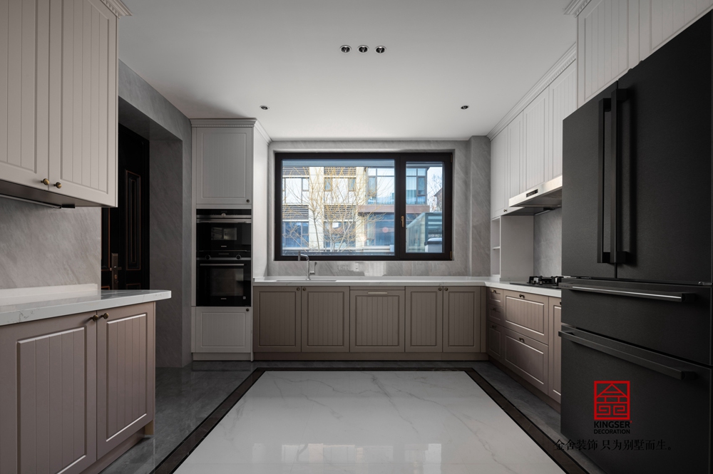 巧妙地融合了餐厅与厨房的空间,创造了一个开放而又不失独立性的餐厨一体化区域。这一设计理念旨在让烹饪与用餐的体验更加流畅,同时也增强了家人与朋友之间的互动。餐厨空间的中心位置,我们精心打造了一个岩板中岛台。中岛台不仅作为厨房的操作台,还充当了餐厅与厨房之间的自然分隔,既保证了两个空间的独立性,又确保了视线的通透与流动。