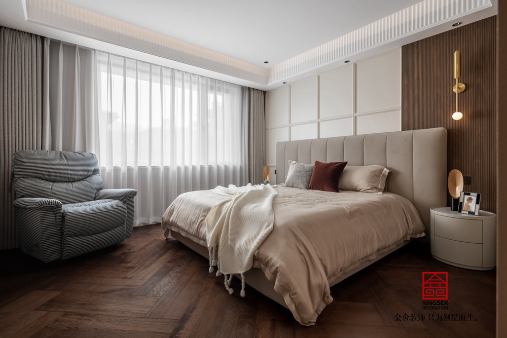 三层的空间就属于完全的静区了,除了一个三合一套间式的主卧之外还有一个书房。主卧完全采用深棕色木地板,吻戏而舒适,玻璃砖的设计保证了走廊的采光,将近四十平的卧室也给人一种气派而美观的感觉。