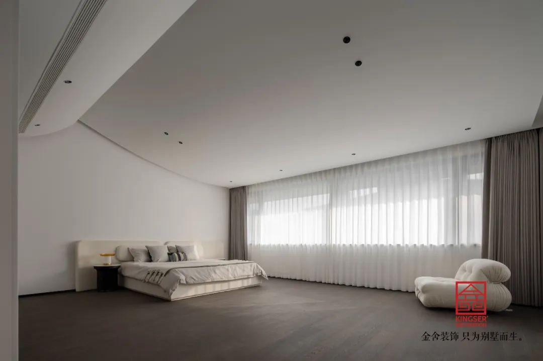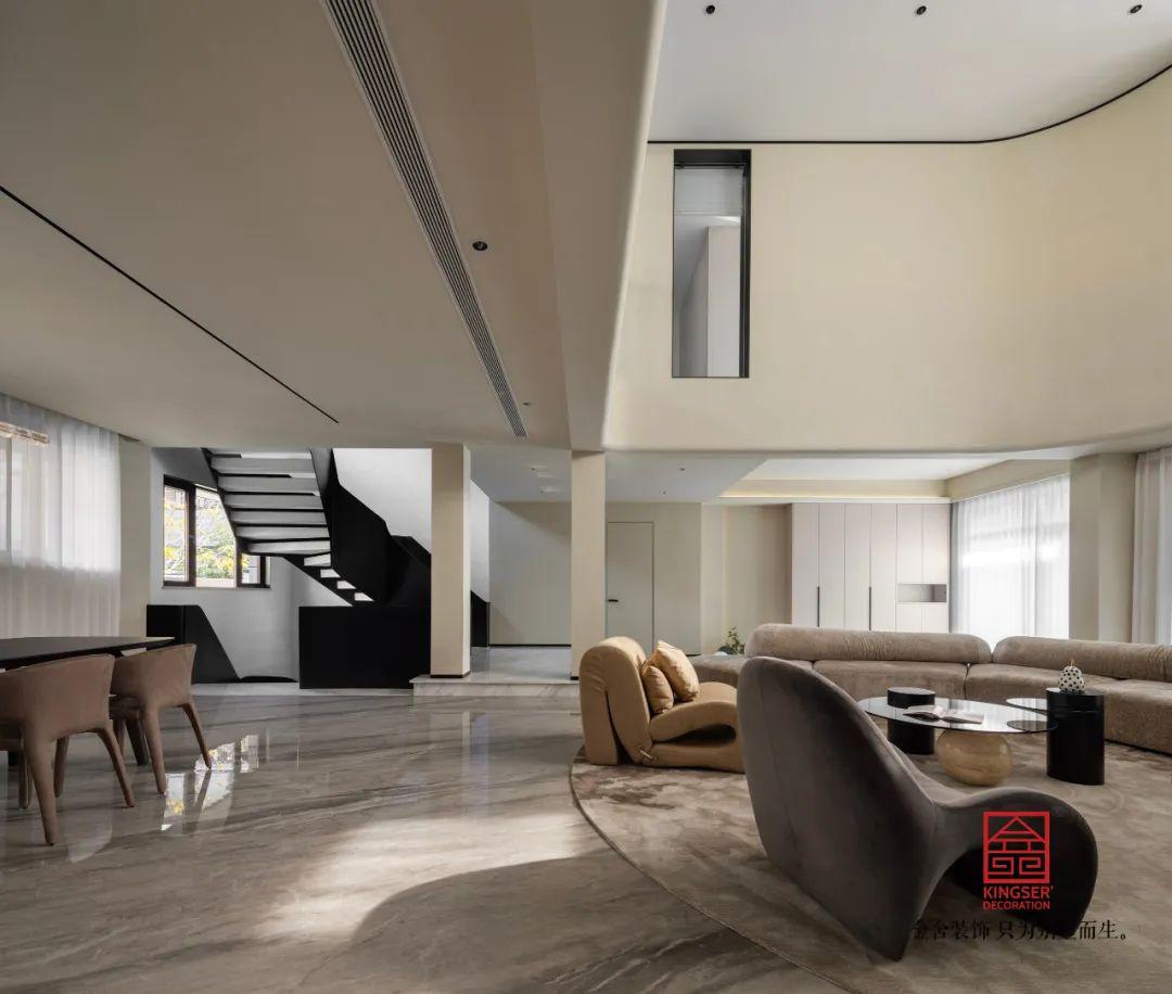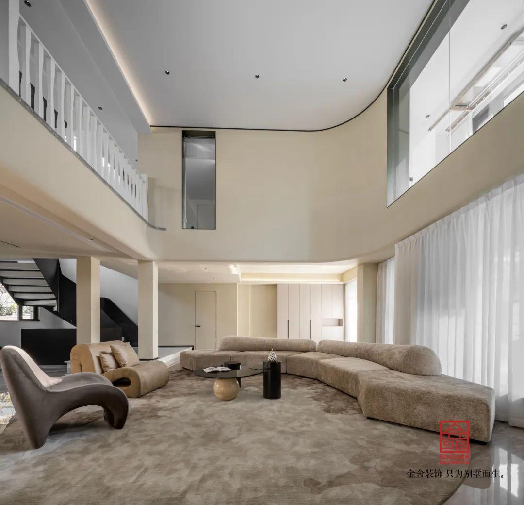 巨大的挑空空间之下,是设计师对于设计的把控,首层6米挑空客厅以钢化玻璃幕墙打造通透感,双层中空玻璃引入充沛自然光,半开放的厨房、岛台吧台与落地窗景融为一体。全屋采用暖白、卡其、米咖等低饱和色调,墙面哑光质感涂料与浅咖沙发碰撞,塑造出极具质感的空间。