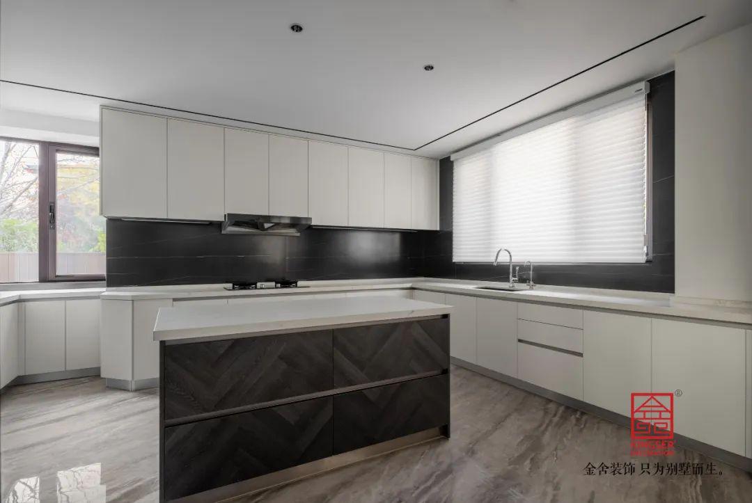 黑白配色的半开敞式厨房,中导台也置入其中,经典的配色随时都不会让人感觉到厌烦,巡回式动线合理且流畅。