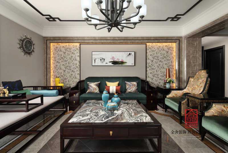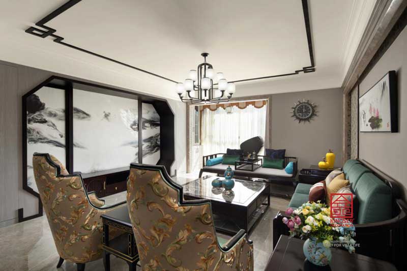 客厅采用的是简约与中式合而为一的就家具。配上造型独特,写意水墨风十足的电视墙,既能凸显出中式文化的厚重,又让整个风格整体协调,顶面木条吊顶装饰呼应电视墙与家居的配色造型,让线与面融汇到整个家居之中。