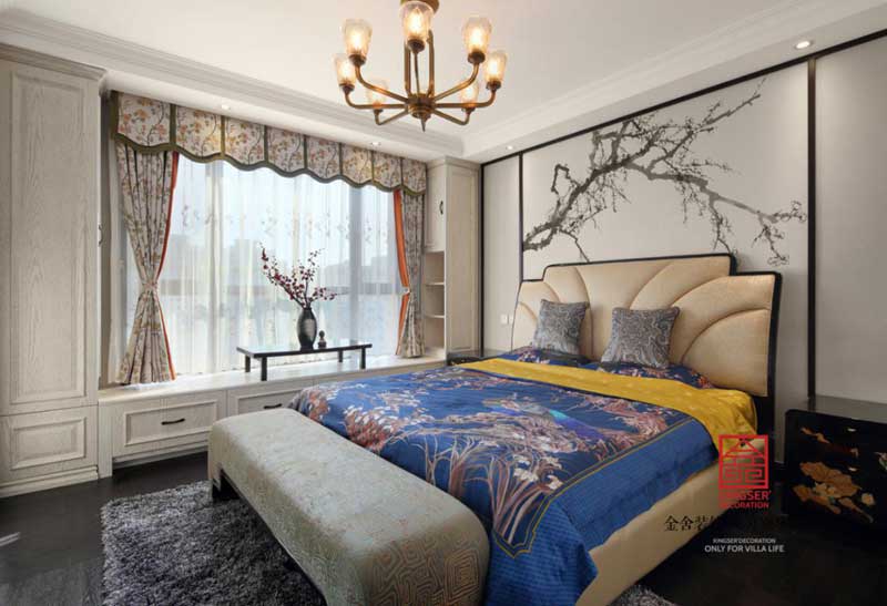 缎锦的宝石蓝和丝绸的浅湖蓝与背景墙象征这海天相接,相辅相成,每一个颜色都形成一种深远的意境,或萧瑟,或广阔,或沉稳,或舒扬,不同的情景不同的韵味成就不同的家居舒适空间。