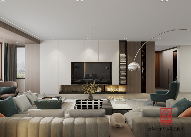 移步至客厅空间,延续经典爱马仕橙的抱枕及皮质沙发,左右搭配不同形状的坐等,围合了空间又充满生活俏皮质感,墙面装饰木作与石材的自然组合,将整个空间带入自然的调性中,艺术化吊灯点亮整个空间的陈列。黑白灰作为空间的点缀色,渲染出沉稳儒雅的气质,在墙面艺术品的选择上,以吸睛的质感为主,冷暖之间,相得益彰。通过窗外的自然光线与顶部打下来的光束,保证足够的采光也使得整个空间充盈着家温暖,设计将整体材质、形状、与光用坠感与动感叠加呈现,赋予整体空间理性与感性的情感表达。