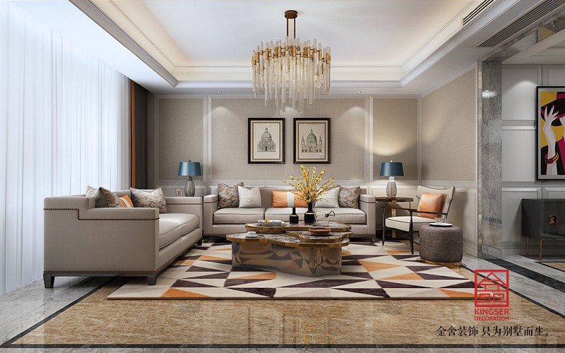蓝、黄是梵高最爱用到的色彩,我们把它融入公共区域。黄色绒布抱枕、窗帘明度最高,令人感到温暖和愉悦,相对的台灯就选择了蓝色,中和掉明黄的跳跃,给人以安静、舒适的氛围。灯管、茶几、饰品等少量铬金属和黄铜色的点缀,隐隐透露着低调的奢华感,不同材质的黄色给予了环境多层次碰撞的可能性。