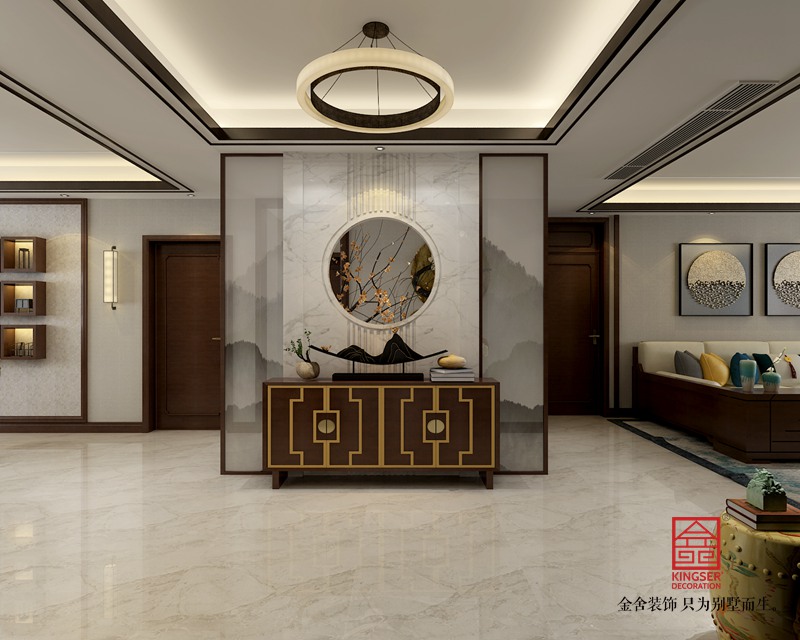 空间规划时,设计师用博古架的形式围合成对称通透的住宅门厅,门厅分隔开中餐厅与会客厅,让两个空间都相对正式和独立