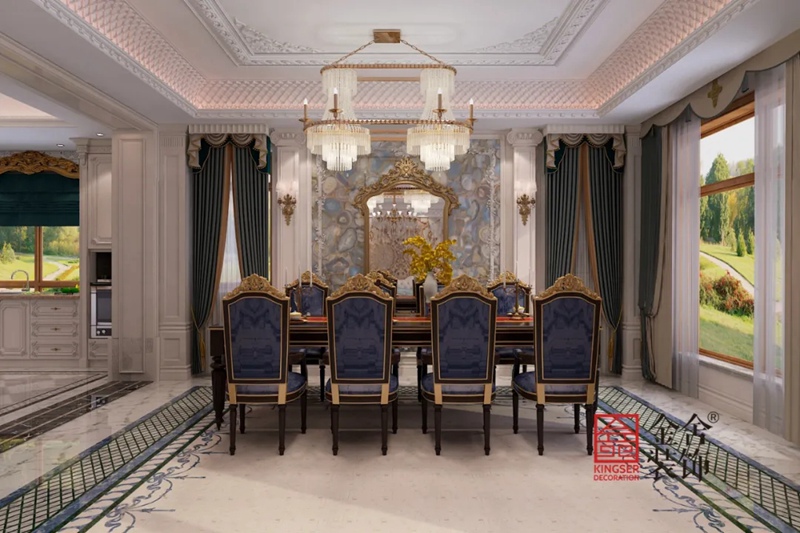 餐厅在细节的边缘和花卉中点缀了金光闪闪的金色,让整个空间熠熠生辉。同时在餐厅的餐桌还是餐边镜还是家居构设,每一处的设计,都经过设计的精细打磨,因此,能够在实景中装饰出完整纯正的法式风范。