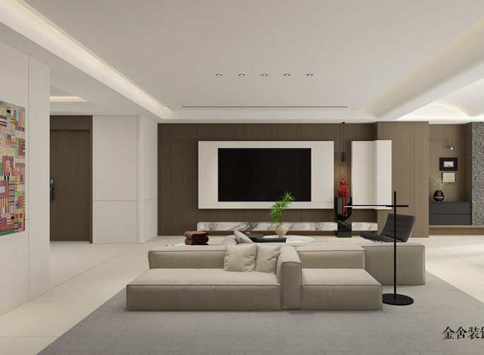 材质上,木质墙面传递自然温润,大理石元素增添精致感,不同材质的碰撞让层次更丰富。布局上,宽大的米色组合沙发成为空间核心,围绕电视背景墙,构建出舒适的社交与休憩场域,背景墙简约大气,与整体风格相得益彰。
