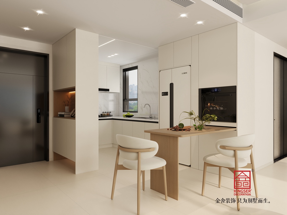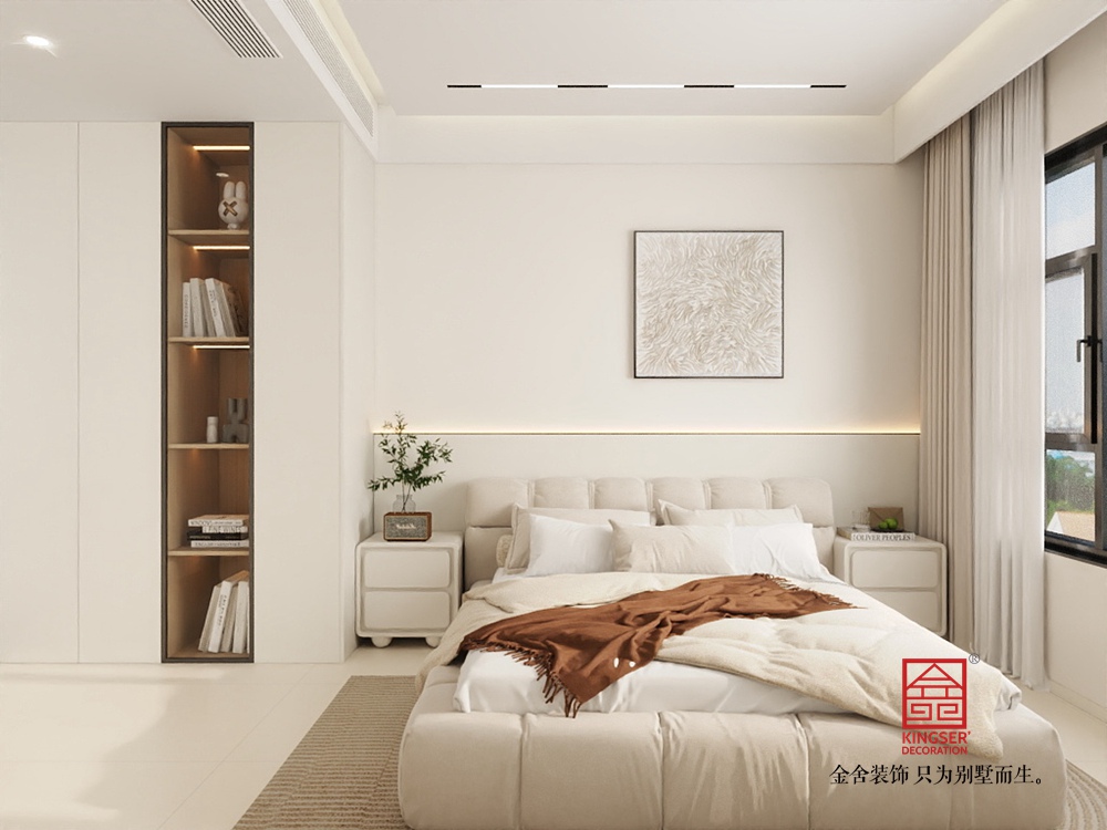 本客厅设计聚焦现代轻奢与实用功能的融合。以简洁的白色为主调,搭配木质元素,营造出温馨且雅致的氛围。墙面设置投影幕布,结合下方的仿真火焰装置,打造出兼具观影与氛围感营造的核心区域,满足休闲娱乐需求。家具选择上,弧形白色坐凳与造型独特的茶几,为空间注入柔和与精致感。整体布局通透,大窗户引入充足自然光线,让空间更显开阔舒适,是一个集美观与实用为一体的高品质起居空间。