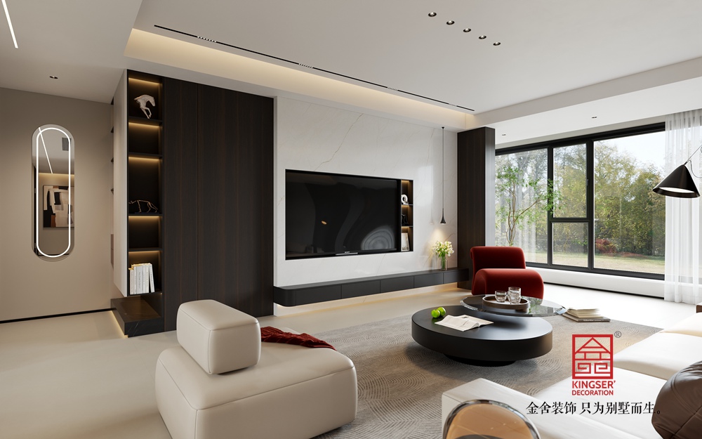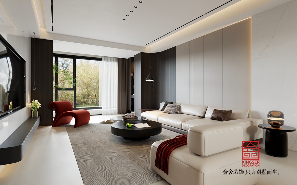 浅米色的大沙发,搭配色彩层次丰富的抱枕,为休憩提供舒适且具美感的载体。黑色圆形组合茶几,造型简约又不失设计感,与整体空间的利落线条相呼应。一旁的白色单人沙发,搭着红色织物,既丰富了色彩层次,又增添了温馨感,红色异形休闲椅更是以亮眼色彩和独特造型,成为空间的点睛之笔,注入艺术活力。