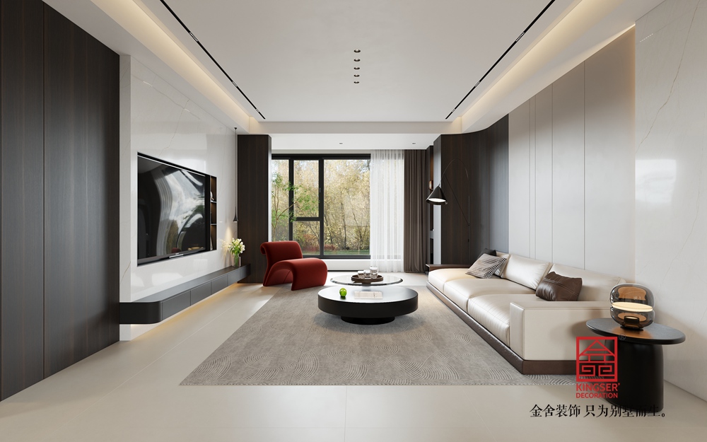 该客厅设计紧扣意式轻奢的风格。空间以柔和的浅色系为基底,搭配深色木质元素,营造出平衡且有质感的视觉效果。