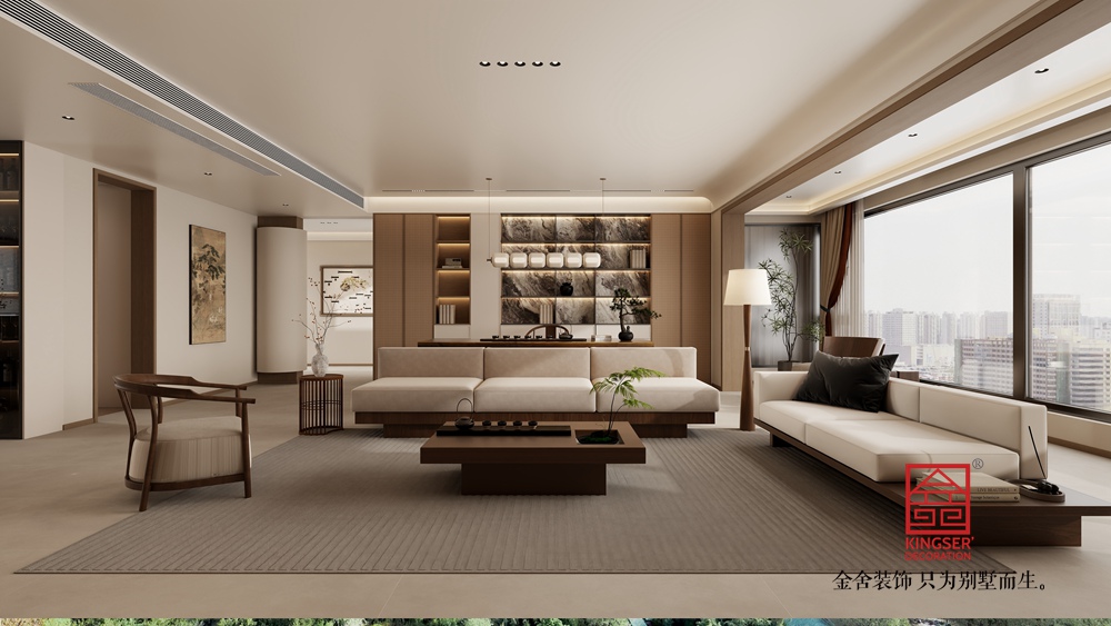 宽阔的落地窗引入充足自然光线,搭配雅致的窗帘,让室内外景致交融。空间中点缀的绿植、中式摆件,以及墙上的简约装饰,都为空间增添了文化气息与自然意趣,打造出一个兼具实用性与美学价值,能让人在现代生活中感受东方美学底蕴的惬意居所。