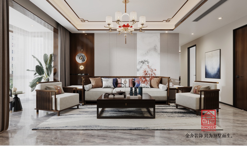 家具造型汲取中式传统形制精髓,线条简洁流畅,实木框架搭配软包,既保留古朴韵味,又具现代舒适感。墙面的山水纹理装饰、精致的中式吊灯,以及茶几上的瓷器摆件,处处彰显中式美学的雅致。