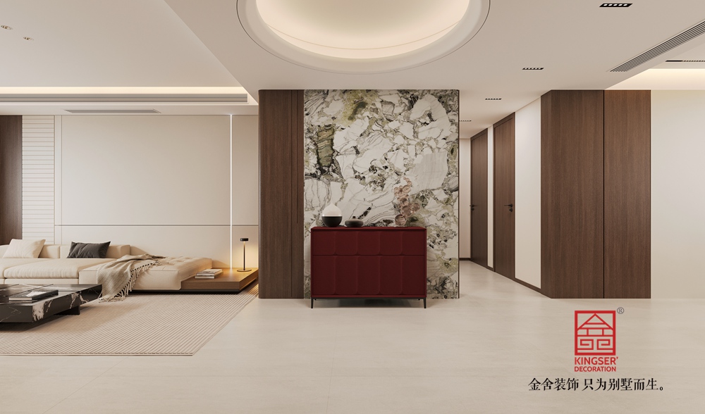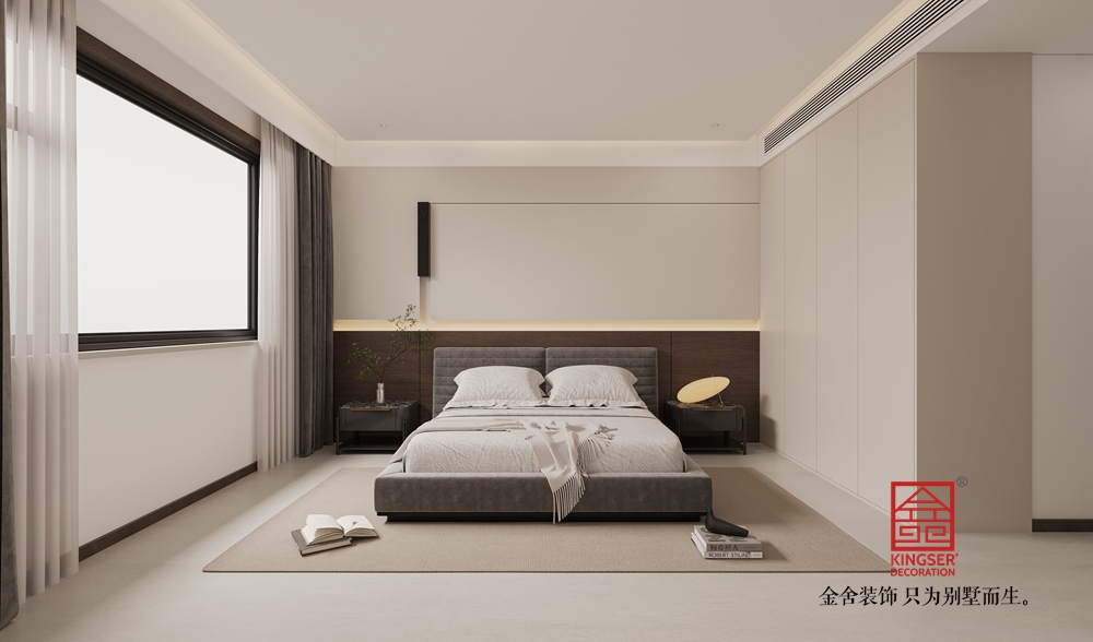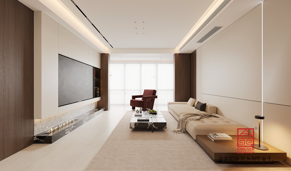 采用开放式布局,将观影、休憩功能有机整合。线性灯光设计强化了空间纵深感,隐藏式灯带与点光源结合,营造出柔和且富有层次的照明效果;大面积落地窗搭配百叶帘,保证采光的同时兼顾隐私,让空间在通透与雅致间找到平衡。